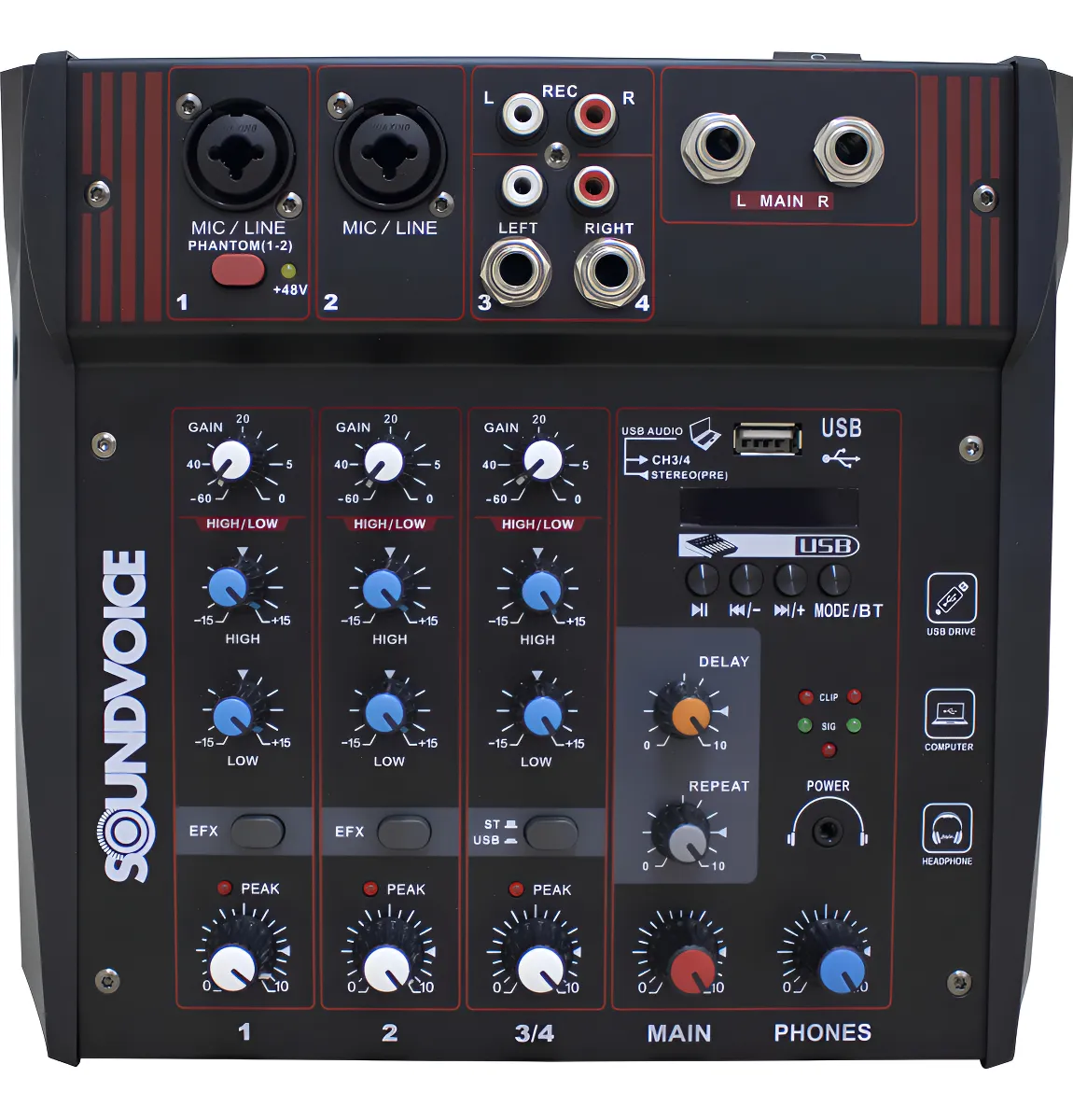 🎚 4 canais com entradas profissionais